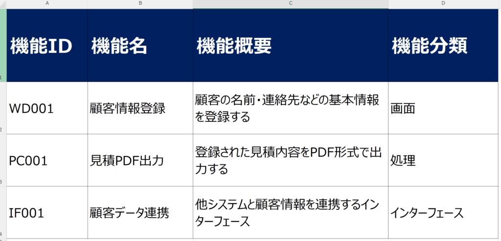 - 機能ID、機能名、機能概要、機能分類で構成しよう